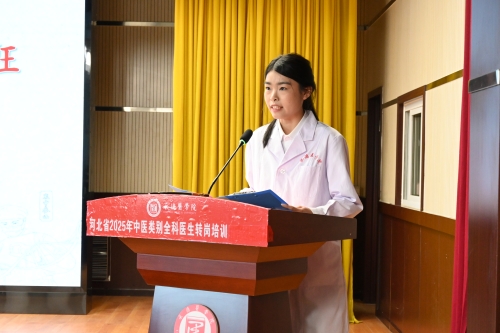 特色班负责人代表、中医康复教研室主任赵玉堂在发言中表示,将坚守“守正创新、分类培养”,助力学员成长,传承岐黄薪火。学员代表彭佩佩表达了对中医药事业的热爱与责任感,承诺将潜心学习,努力成为“理论扎实、临床过硬、创新活跃、人文深厚”的中医药后备人才,不负学校期望与青春韶华。
