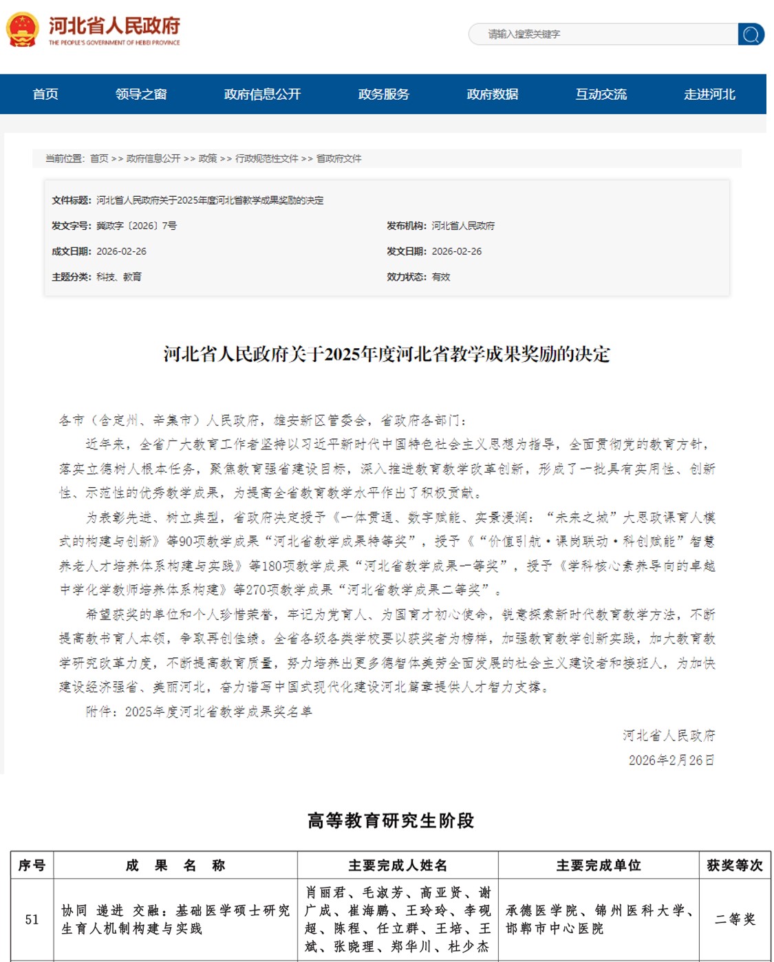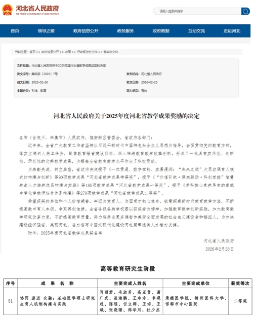 近日,河北省人民政府发布《关于2025年度河北省教学成果奖励的决定》(冀政字〔2026〕7号),我校凭借在研究生教育教学改革领域的深耕与创新,荣获河北省教学成果二等奖1项,第一完成人:肖丽君教授,项目名称《协同 递进 交融:基础医学硕士研究生育人机制构建与实践》。